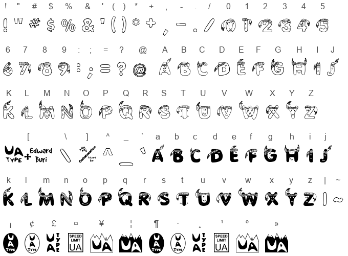 Freeware by UnAuthorized Type and Edward Buri. Macromedia Fontographer 4.1 EDB Indians. EDB Indians. Version 1.00 12/15/97. EDBIndians. Collaboration between Ben McGehee of UnAuthorized Type and Edward Buri.. UnAuthorized Type. Ben McGehee. This version includes upper and lowercase letters and most punctuation. I also included some UA Type dingbats (just to amuse myself, and so you don't get those annoying boxes when you type something that isn't in the font).