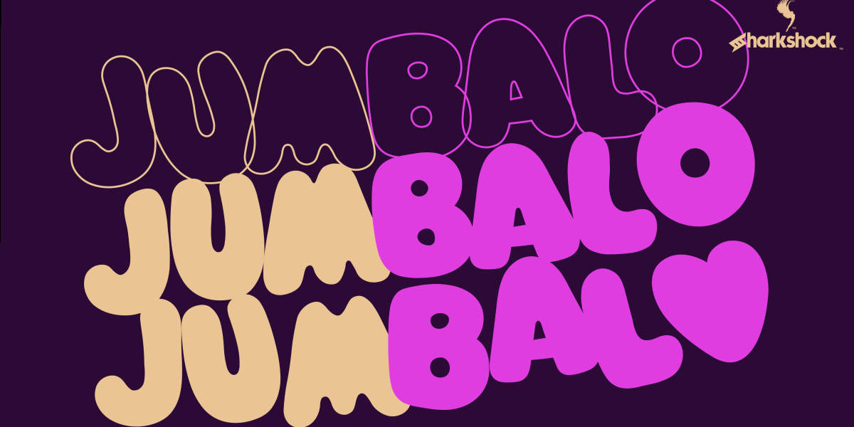 The Jumbalo font is an extremely heavy and playful display typeface, characterized by its thick, bulbous, and completely rounded characters. It evokes a strong sense of retro aesthetics, reminiscent of designs from the 1970s or 1980s. The font is highly versatile, as the promotional image shows it comes in multiple styles, including a solid fill, an outline version, and a variant that incorporates heart-shaped dingbats. Due to its all-uppercase presentation, it is categorized as an initial-caps style.