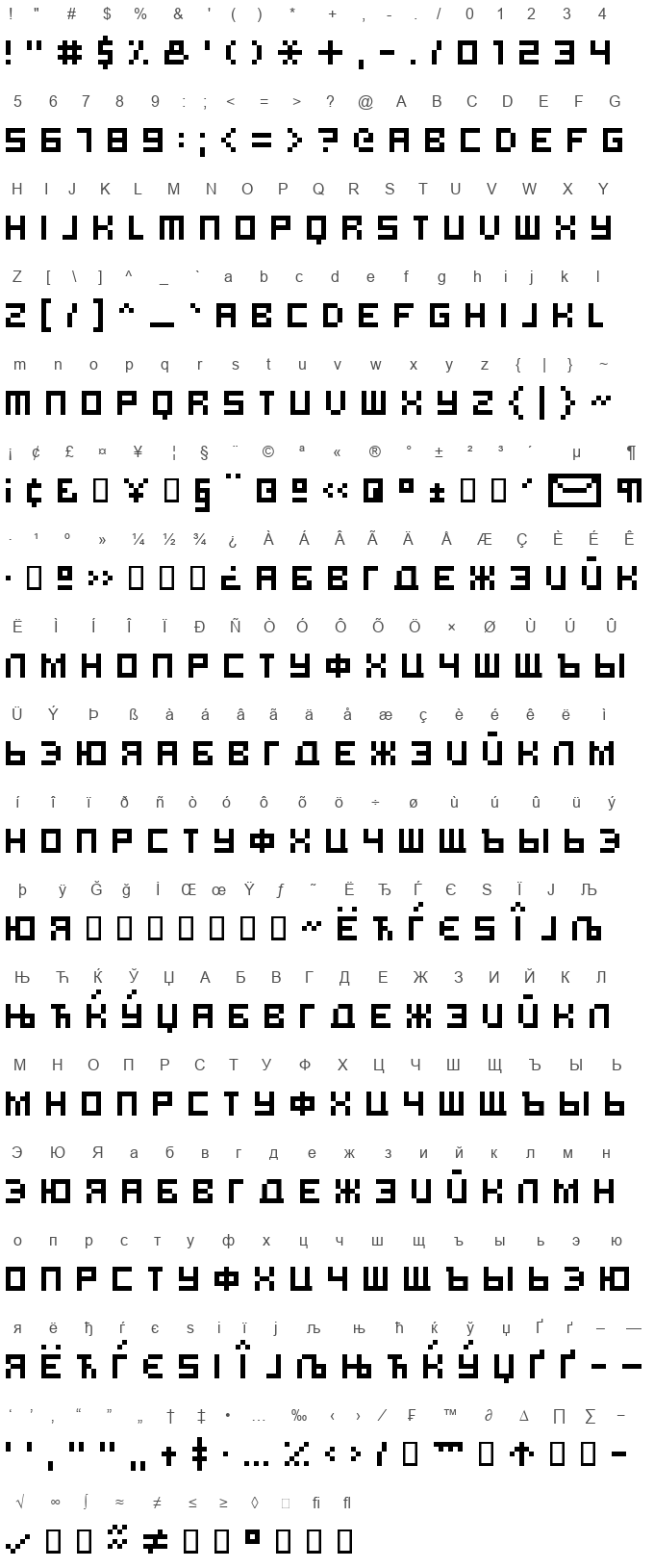 Characterized by its uniform line weight and squarish letterforms, this font showcases a tight construction that promotes readability even at smaller sizes, making it versatile across various applications. The inclusion of Cyrillic characters widens its usability, embracing a multicultural design perspective that caters to a global audience. The numerals and punctuation within the Hooge 05_55 Cyr2 are as meticulously designed as its alphabetic characters, ensuring a cohesive visual flow throughout any textual content.